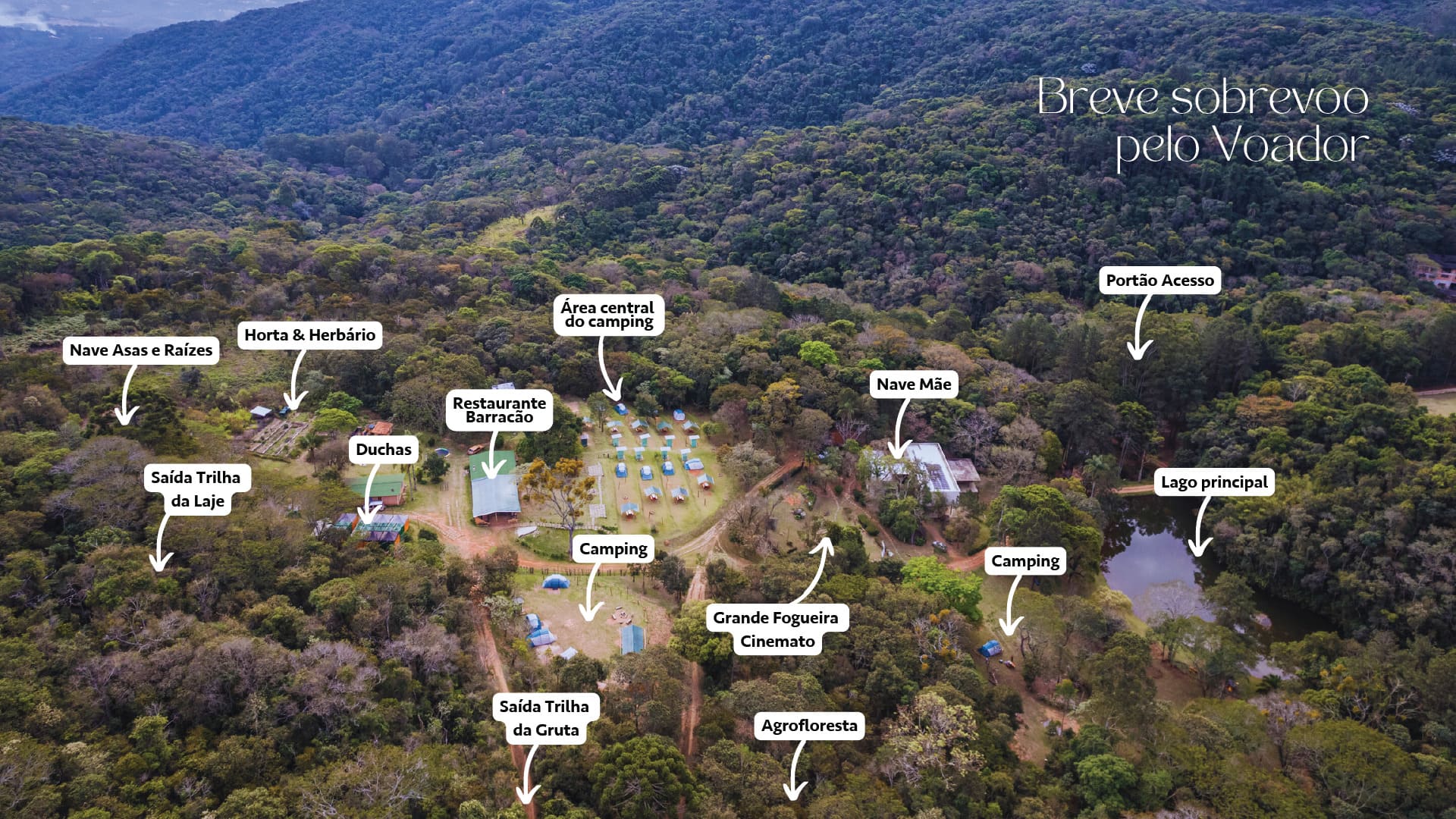 A história do Voador teve início com essa casa, por isso seu nome. São 200 m², dois andares, formato em L, com capacidade para até 130 pessoas por andar. Tem vista para o lago principal e abriga área para atividades, descanso, plenária, oficinas e até um acantonamento.